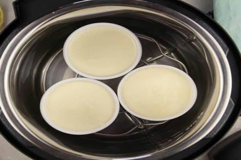۳- کیک و غذا را در قالب یا قابلمه کوچکتر قرار دهید. با احتیاط چون قابلمه برزگ داغ است، قالب را روی پایه قرار دهید.
