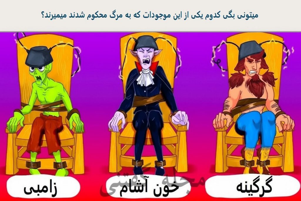 آزمون هوش تصویری مرگ موجود عجیب: در تصویر آزمون هوش تصویری مرگ موجود عجیب ما سه موجود افسانه ای در دنیای غرب را مشاهده می کنیم که بخاطر اعمالی که مرتکب شده اند به اعدام توسط صندلی برقی محکوم شده اند و محکم بر صندلی های برقی بسته شده اند و بزودی به سزای اعمالشان خواهند رسید،ولی باید گفت که فقط یکی از این موجودات با این شیوه میمیرد.