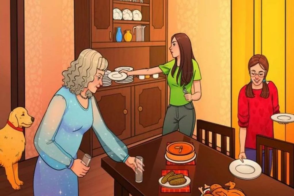 در تصویر بالا، اتاق غذاخوری وجود دارد که مادر و دو دختر او در حال آماده کردن میز برای شام خوردن هستند. یک سگ نیز نزدیک دروازه و پشت سر زن قرار دارد. مادر در حال چیدن لیوان ها است و دو دختر نیز در حال چیدن بشقاب ها هستند. یک بوقلمون خوشمزه سر میز به ما چشمک می زند و کنارش غذاهای دیگر نیز است.