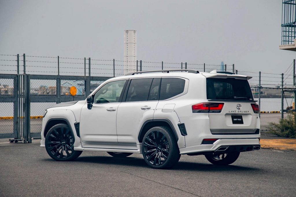 همچنین قوس چرخهای بزرگ و پهن لیبرتی واک به خوبی با خطوط زاویهدار و برجسته تویوتا لندکروزر ۳۰۰ ترکیب شدهاند و شاید حتی برخی افراد ناآگاه آن را با تریم های اسپرت فابریک خود تویوتا اشتباه بگیرند. یکی دیگر از بخشهای کیت لیبرتی واک سپر جلوست که بسیار شلوغتر از نسخه استاندارد است. در بخش عقب نیز خروجیهای اگزوز جدید با بال بزرگ و اسپویلر روی صندوق همراه میشوند. همچنین این قطعات به همراه جلوپنجره و کاپوت از فایبرگلاس یا پلاستیک تقویت شده با فیبر کربن تولید خواهند شد. علاوه بر این امکان سفارش کاپوت با فیبر کربن نیز وجود دارد.