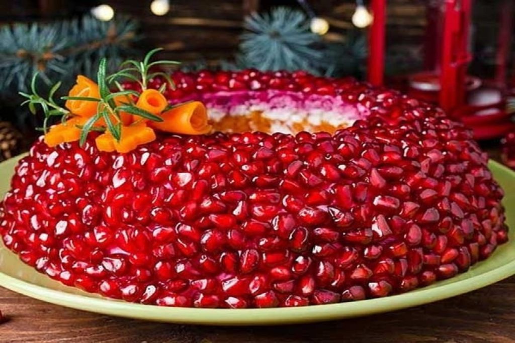 دانه های انار را به لایه سوم اضافه می کنند، سس مایونز می زنند.